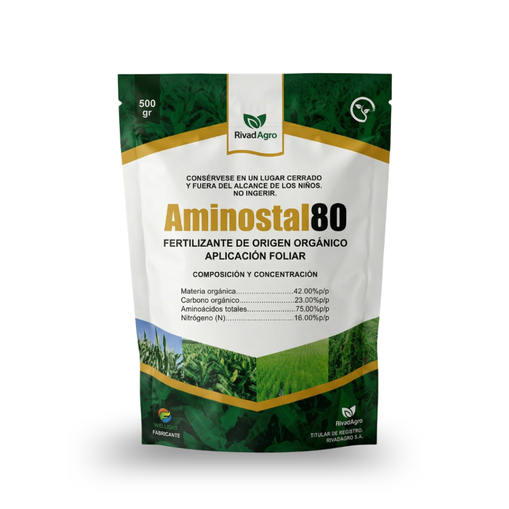 AMINOSTAL 80 es un fertilizante orgánico de aplicación foliar con una alta concentración de aminoácidos. Está diseñado como un potente activador metabólico y una fuente de nitrógeno de asimilación inmediata. Su alta carga de carbono orgánico ayuda a mejorar la actividad biológica del suelo y la eficiencia en la absorción de nutrientes.